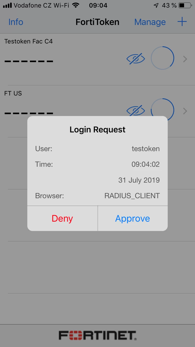 - The FortiToken Mobile app is then used to process notifications and shows a pop-up with logon details.