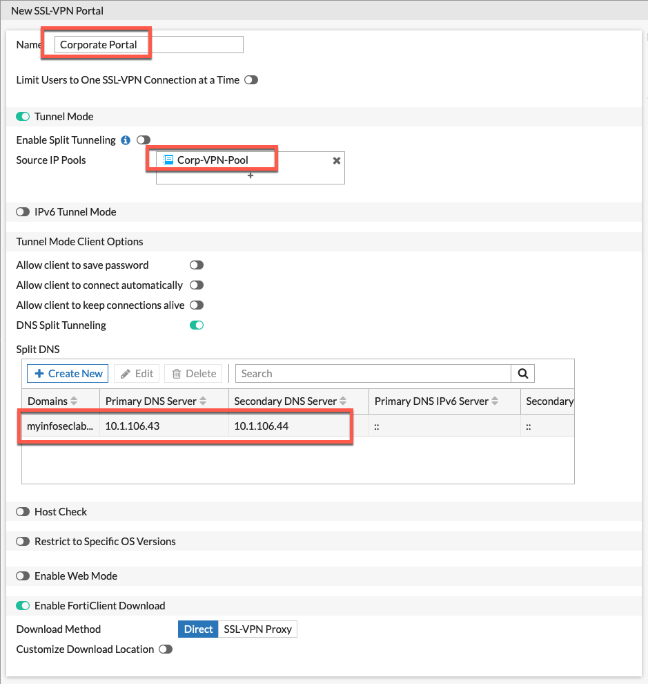 On the Contractor Portal we are using the Contractor-VPN-Pool and we are using the system DNS (In our case, FortiGuard Labs).