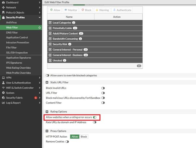 - The FortiGate effectively goes into a 'fail-open' state, temporarily bypassing web filtering controls. Traffic that would normally be blocked (e.g., adult, gambling, or malicious sites) may be allowed. However, all other UTM and security inspection features, such as IPS, Antivirus, Anti-Botnet, and Application Control, continue to operate normally. The rating error event is still recorded in the FortiGate web filter logs; refer to FortiGuard web filter error logs.