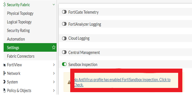 #config system globalAfter refresh or re-login to the device, go to Security Fabirc -> Settings and enable 'Sandbox Inspection'.